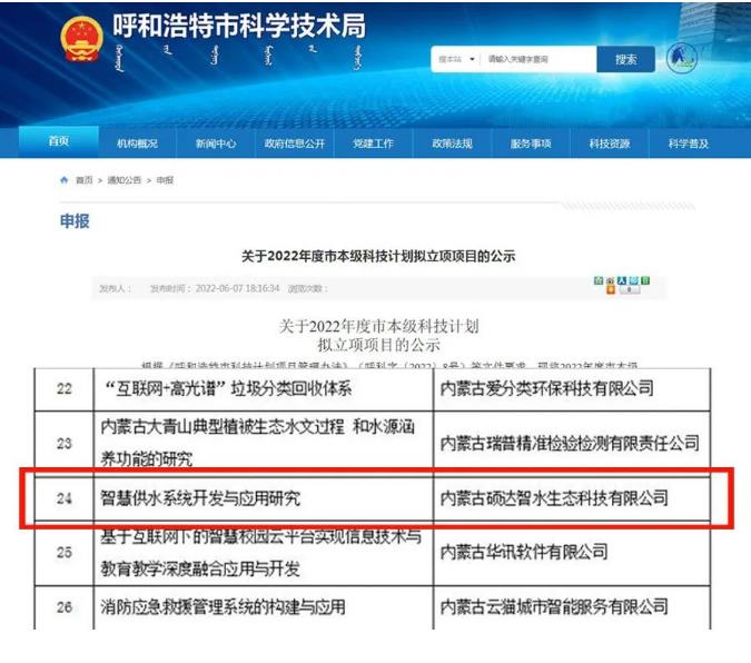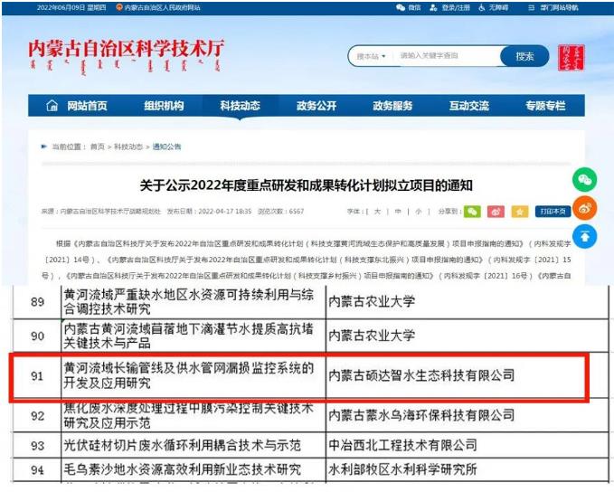 碩達智水作為水生態領域高新技術企業,科研創新是企業發展第一驅動力,公司水生態研究院一直專注于新技術、新產品的研究探索。近期,內蒙古自治區科學技術廳發布“關于公示2022年度重點研發和成果轉化計劃擬立項目的通知”,與呼和浩特市科學技術局發布“關于2022年度市本級科技計劃擬立項項目的公示”碩達智水兩大科研項目名列其中。