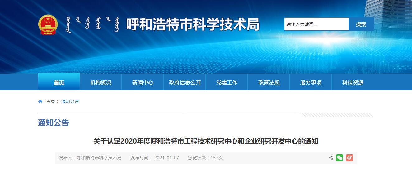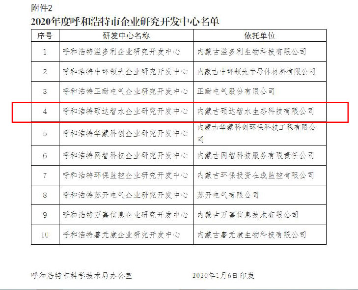 1月6日,呼和浩特市科學技術局發布,關于認定2020年度呼和浩特市工程技術研究中心和企業研究開發中心通知,認定10家企業研究開發中心為2020年度呼和浩特市企業研究開發中心,內蒙古碩達智水生態科技有限公司名列其中。